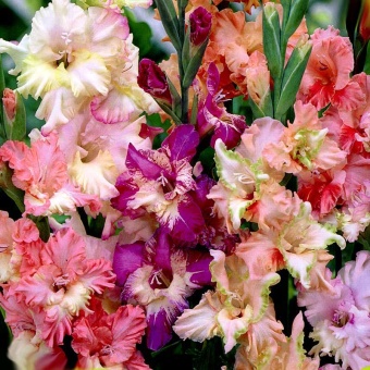Гладиолус Frizzled-Растение высокое, высотой до 120 см. Листва мечевидной формы, ярко-зелёная. Соцветия представлены крупными цветами тройной окраски: светло-зелёной, жёлтой и розовой. Цветок супер гофрированный. Смотрится гладиолус Frizzled благодаря таким бутонам очень эффектно.