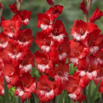 Гладиолус Helvetia-многолетнее луковичное растение с яркими цветами, изысканно сочетающими в себе красный и белый цвет и имеющими гофрированные края. Цветки крупные, на соцветиях колосовидной формы, размером 6-12 см., на прямом стебле высотой 100-120см. Цветет беспрерывно все лето с июля по сентябрь, очень привлекательно смотрятся в праздничных букетах. Также порадуют любого садовода в клумбах и садах. Лепесток устойчивый к ливням.. Запах отсутствует. Зиму переносит хорошо.