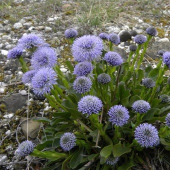 Точечная глобулярия (Globularia punctata) — она же крапчатая. Цветет уже летом, до июля. Восхитительные синие соцветия поднимаются на 20–25 см над розеткой листьев. Существуют культивары с белыми цветами. Не столь чувствительна к морозам, зимостойка, особенно под снегом.