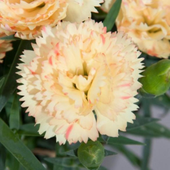 Гвоздика Colores Oro – образует густой, хорошо разветвлённый кустик высотой 20-25 см. Цветки диаметром 3-4 см, с кремово-желтыми махровыми цветами. На кончиках лепестков есть небольшие красные штришки.