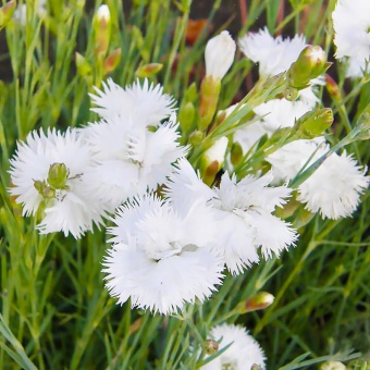Гвоздика Мисс Синкинс является очень ароматным сортом. Белая гвоздика, несомненно, одна из самых известных. Его махровые цветы с особенно лощеными лепестками в изобилии распускаются в мае-июне над подушкой из вечнозеленых серо-голубоватых листьев. Многолетнее растение без проблем, незаменимо для бордюров, рокариев и цветочных растений, на ярком солнце. Отличный срезанный цветок.