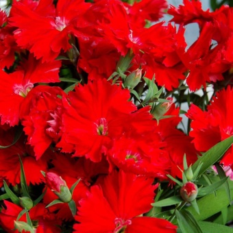 Гвоздика китайская «Coronet Scarlet» словно сказочный Аленький цветочек распускается крупными махровыми цветками с резными лепестками, которые полностью покрывают куст. Образует корону из цветов до 10 см в диаметре. Обильное цветение на компактных кустиках с тёмно-зеленой листвой — незабываемое зрелище! Начинается в июле и длится до осени. Листья этих растений узкие, облиственные стебли прямые. Куст высотой и шириной 20-25 см.