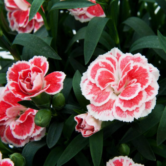 Гвоздика Oscar White and Red — имеет махровые цветки с бледно-красным центром и растушеванными белыми краями. Гвоздика этой серии образует густой, хорошо разветвлённый, гармоничный кустик, весь покрытый крупными махровыми душистыми цветками. Растение многолетнее, компактное, имеет однородный рост и отличное ветвление. Цветение раннее и продолжительное. Высота куста 10-20 см., цветки диаметром 4-5 см.
