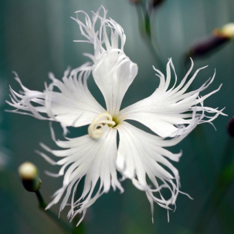 Цветки душистые, часто одиночные. Чашечка цилиндрическая, длиной 18-25 мм, с заострёнными зубцами; прицветные чешуи в числе четырёх, яйцевидные с коротким остроконечием, прикрывающие четверть чашечки. Лепестки белые, пластинка их глубоко бахромчато-многораздельная на нитевидные доли, на верхней стороне с волосками, зеленоватым пятном и пурпуровыми точками. Цветёт в июне-июле