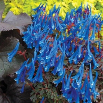 Хохлатка узколистная «Блю Херон» ( «Голубая цапля») — многолетнее растение высотой до 20-25 см. Листья зеленые с сизым налетом, многократно перистые. Цветки яркие, васильково-голубые на высоких, стройных цветоносах, и, правда, напоминающих статную цаплю. Цветёт с июня по июль. Любит полутенистые места. Предпочитает увлажненные богатые гумусом почвы.