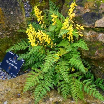 Хохлатка рассеченнолистная Pinuin «Corýdalis cheilanthifolia» — в высоту достигает не более 20-30,окраска цветка желтый,цветет — Май