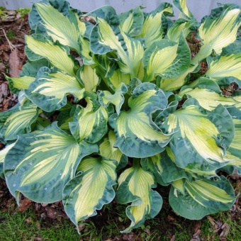 Большая хоста, в ширину со временем разрастается до 80 см, листья округлые, слегка морщинистые, размером 23х15 см, трёхцветные, зелёные с нерегулярными светло-зелёными полосками и кремовым центром (весной) и зеленоватым (летом), цветки белые, высота цветоносов 80 см, спорт от H. sieboldiana «Elegans».