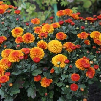 Гир Гар – компактный сорт, с кустами высотой около 30 см. Эта хризантема относится к низкорослым сортам. Цветы у описываемого растения желто-оранжевого оттенка, махровые, диаметром 3-4 см.