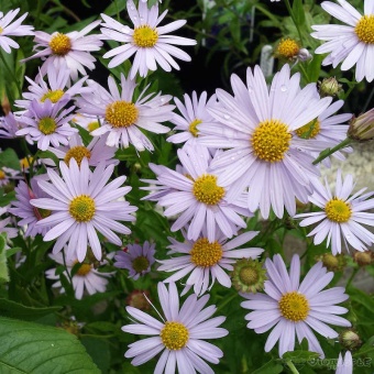Калимерис Юмена “Shogun” kalimeris yomena Травянистый многолетник высотой до 30 см с ланцетными, узкими, зубчатыми, зелеными с желтой каймой листочками. Цветки сиренево-голубые, напоминают многолетнюю астру. Цветение в августе-сентябре.