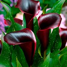 Луковицы каллы Одесса (Calla Odessa) – необычный, очень декоративный сорт с крупными ароматными цветками фиолетово-черного цвета красивой ярко-зеленой листвой с белыми вкраплениями.