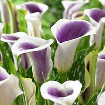 Необычная расцветка этого тропического растение привлечет внимание любителей цветов – шикарная Калла Пикассо (Calla Picasso) обладает необычайном окрасом. В глубине белого бутона затаилась синева ночного неба, по листьям растения рассыпались белые капельки крапа. Растение настолько декоративно, что сразу же привлекает внимание. Выращивать этот сорт можно в открытом грунте и горшках, любит обильный полив. Предпочитает немного затененные места, хорошую почву и дренажом. В открытый грунт высаживается только после последних морозов. После цветения желательно удалять лишние листья. Красива в одиночных посадках и клумбах.