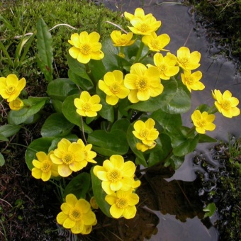 Одно из самых раноцветущих прибрежных растений. Стабильно декоративна за счет листвы. Высотой до 30 см, листья кожистые, плотные, блестящие, округлые. Цветки золотисто-желтые, диаметром до 4,5 см, собраны в немногочисленные соцветия на верхушке побегов; цветет в апреле-мае. Светолюбива, выносит легкое затенение. Предпочитает глинистые, хорошо увлажненные или даже болотистые почвы. Может расти на более сухих почвах при условии постоянного полива. Длительность выращивания на одном месте: 5–6 лет.