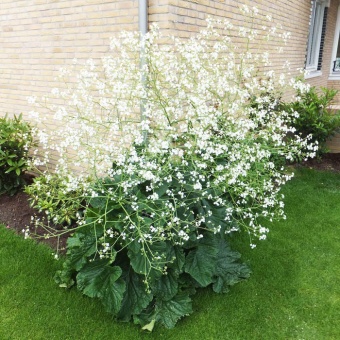 Катран сердцелистный – это травянистый многолетник, достигающий в высоту 1,5 метра. Листья в прикорневой зоне большие, по форме – сердцевидные. Пластина листа в длину 30 см, а вместе с черешком – один метр. Основные листья тонкие, края острые, зубчатые. Стеблевые – редкие, ромбические, с крупными зубчиками, длина около 12 см. Цветки катрана небольшие, окрашены в белый цвет, представляют собой кисть. Она образует ветвистое соцветие. Период цветения июнь — июль.