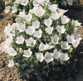 Колокольчик карпатский «Avida White»- невысокое компактное растение с тонкими изящными стеблями и крупными белоснежными цветами. Покрывают весь кустик. Листья округлые, ярко-зеленые. Стебли облиственные, черешки листиков короткие, высота цветоносов 10–15 см. Обильно цветет с июня до сентября.