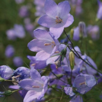 Цветки собираются в метельчатое и довольно раскидистое соцветие, такие цветки могут быть как поникающими, так и наклоненными. Цветение колокольчика круглолистного приходится на период, начиная с июля и заканчивая сентябрем месяцем.Предпочитает песчаные или достаточно дренированные почвы. Неприхотливо, с продолжительным цветением.