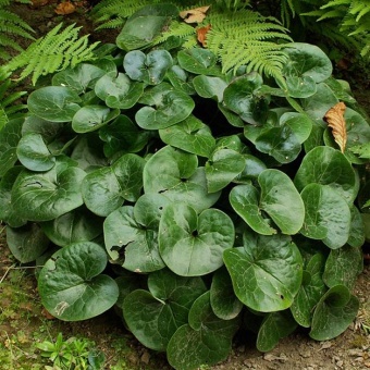 Копытень европейский «Asarum europaeum» — в высоту достигает не более 10-12см.,окраска цветка округлые блестящие листья, буровато-пурпурные цветы,цветет — Май