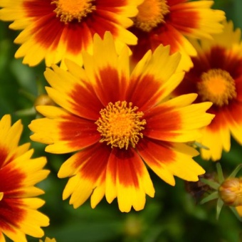 Кореопсис Uptick Gold (Аптик Голд). Компактный сорт из серии UpTick. Многолетник, образующий аккуратную кочку из средне-зеленых листьев. Цветет непрерывно с середины лета до осени. Цветение чрезвычайно обильное. Цветки крупные, яркие, желто-красные. Хорошо растет на солнце, на умеренно влажных, хорошо дренируемых почвах.