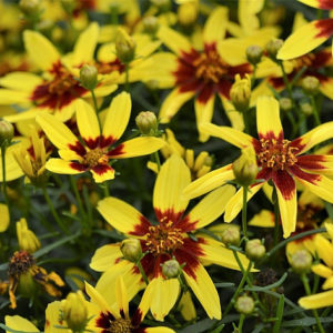 Цветы желтые с винно-красным пятном. период цветения длится с июля и до середины сентября. Цветы вместе с богатой листвой образуют плотный яркий ковер. Его высота не превышает 30 см. Сорт рассады кореопсиса «Светлячок» отличается высокой морозостойкостью и устойчивостью перед болезнями и вредителями. Высаживают его в одиночных и групповых цветниках, бордюрах и миксбордерах.