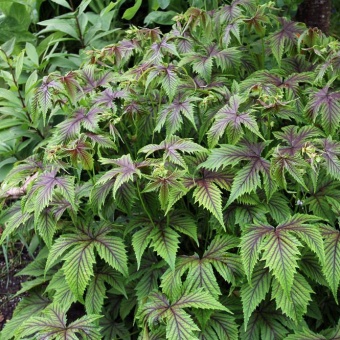 Цветки красновато-розовые, в соцветиях. Листья декоративные, зелёные с пурпурными пятнами в центре и полосками вдоль прожилок, которые особенно заметны у молодых листьев и на солнце. Растение компактное, высотой 60-80 см