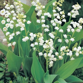 Ландыш майский Bordeaux «Convallaria majalis» — в высоту достигает не более 15-20,окраска цветка белый крупный,цветет — Май-июнь/ Цветки очень ароматные, крупные, чисто-белые колокольчатые, в соцветии по 8-12, в отличие от видового ландыша, у которого в соцветии по 6-8 цветков. После цветения образуются мелкие оранжевые плоды. Листья тёмно-зелёные.