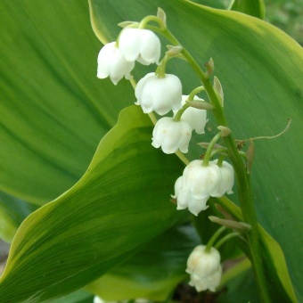 Цветки белые, большие. Цветение в мае-июне. Листья с нерегулярной золотистой каймой. Цветы белые, колокольчатые. Собираются по 8-15 шт на одном цветоносе. Высота 15 см. Хорошо растёт в полутенистом месте. Почва влажная, дренированная, богатая органикой.