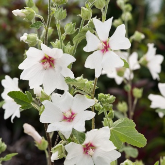 Лаватера Barnsley Baby (Барнсли Бэби). Растение компактное и невысокое, 60-80 см. Цветки белые или слегка розоватые с ярко-розовым глазком, очень нежные и красивые (примерно 10 см). Можно выращивать в контейнерах, но лучше смотрится в цветниках с шалфеем, котовником и злаками.