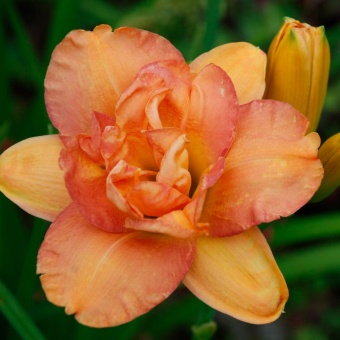 Цветки махровые, персиково-розовые с зеленовато-желтым горлом, диаметром 14-15 см.