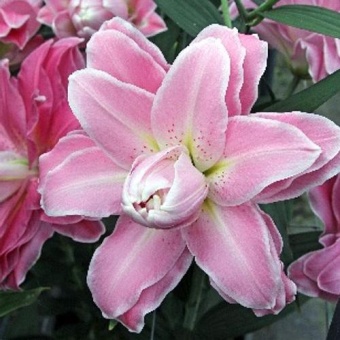 Лилия Акколейд относится к группе восточных гибридов. Высотой 110-120 см. Цветы махровые, розовые с белой каймой, диаметром 21 см. Обладает приятным ароматом. Цветет во второй половине лета: июль – август. Всем восточным лилиям необходимы солнце или полутень, сухая хорошо дренированная почва, регулярные подкормки комплексными удобрениями. Зимуют восточные лилии в сухой почве с укрытием.