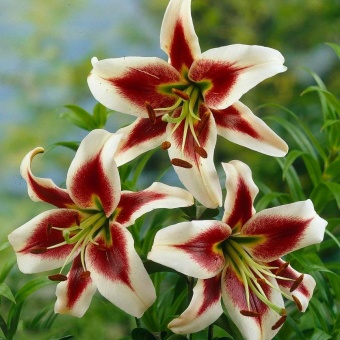 Белые, с винно-красным, звездообразным пятном от центра до середины лепестка