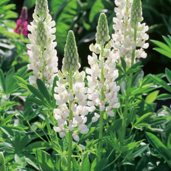 Люпин многолистный «Legendary White Shades» обладает белоснежными высокими соцветиями, которые распускаются в середине лета. Высота до 80 см.