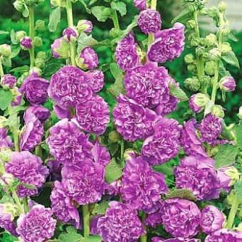 Мальва розовая «Chater’s Double Violet» — декоративный сорт с красивыми крупными цветами. Великолепие сине-фиолетовых махровых цветов с крупными шапками шелковистых воланов сразу привлекает внимание. Весь август и сентябрь они украшают сад своим обильным цветением. Цветы хорошо смотрятся на фоне крупных зеленых листьев. Высота прочного стебля составляет 1-1,5 м.