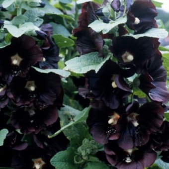 Мальва розовая «Nigra» — яркий сорт с необычными крупными цветками. Во-первых, у них очень оригинальная расцветка. Темно-пурпурные по краям, ближе к центру она становится практически черной. Украшает все нежно-желтая сердцевина в виде звездочки. Во-вторых, на одном плотном стебле могут расцветать и одноцветковые, и многоцветковые, махровые и полумахровые цветы. Цветет обильно с августа по октябрь. Высота растения составляет 1-1,5 метра.