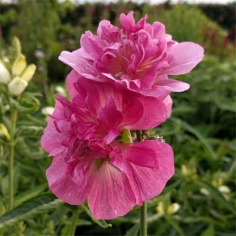 Мальва розовая » Poetry» — яркий сорт с необычными крупными цветками. Во-первых, у них очень оригинальная расцветка Розовый. Во-вторых, на одном плотном стебле могут расцветать и одноцветковые, и многоцветковые, махровые и полумахровые цветы. Цветет обильно с августа по октябрь. Высота растения составляет 1-1,5 метра.