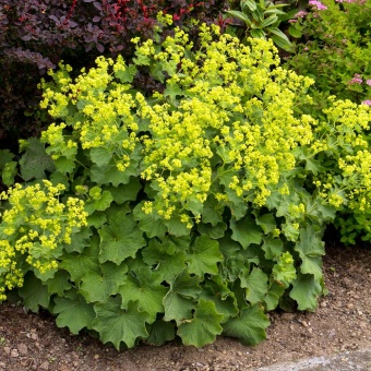 Манжетка мягкая «Robustica» — многолетнее растение с очень декоративным листом. Быстрорастущий куст сферической формы с крупными листиками, сужающимися к основанию. Мягкие серебристо-зеленые, с нежной опушкой и волнистыми краями, они напоминают маленькие воронки. После дождя в них собираются капельки воды, которые блестят как настоящие алмазы. С мая по июль над листиками распускается ажурное зеленовато-желтое облако из цветков, которые еще больше придают листьям декоративность. Высота кустика 40-60 см, а ширина до 90 см.
